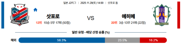 이 경기는 단순한 전력 비교를 넘어서, '섬 원정'이라는 특수 조건과 기후·이동 거리에서 오는 피로 누적까지 함께 고려해야 하는 매치업입니다. 삿포로는 제주도나 울릉도처럼 섬 특유의 지리적 특성을 가진 지역에 위치해 있으며, 홋카이도까지 올라오는 과정에서 원정 팀은 장거리 비행과 환승, 이동 시간을 소화해야 합니다. 따라서 에히메는 킥오프 시점부터 몸이 완전히 풀리지 않은 상태로 경기를 시작할 가능성이 높고, 특히 전반 초반에는 압박 강도와 세컨볼 경쟁에서 뒤처질 여지가 큽니다.