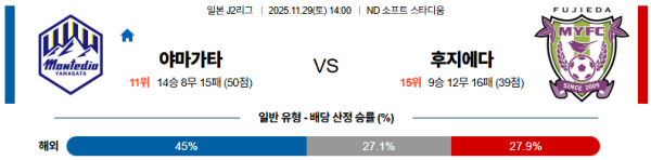 이 경기는 4-3-3으로 중원에서 템포를 쥐려는 야마가타와, 3-4-3을 기반으로 중원 압박을 강하게 가져가는 후지에다의 상성이 베팅의 핵심입니다. 후지에다가 라인을 올려 전방 압박을 시도하는 발상 자체는 나쁘지 않지만, 최근 경기들을 보면 중원 압박 라인이 지나치게 높아지면서 수비형 미드필더가 커버해야 할 공간이 비정상적으로 넓어지는 문제가 계속 드러납니다. 그래서 수비형 미드필더 혼자 넓은 지역을 떠맡게 되고, 그 순간 센터백 앞, 즉 10번 지역이라 불리는 박스 앞 공간이 그대로 노출되면서 상대에게 전진 패스와 슈팅 준비 시간을 동시에 허용하는 장면이 반복됩니다. 이 틈을 노릴 수 있는 쪽이 바로 야마가타의 중원 사령관 다카에입니다. 다카에는 자신 쪽으로 들어오는 패스를 한 번에 전진 패스로 이어주거나, 방향 전환으로 상대 압박을 허무는 감각이 뛰어나기 때문에, 후지에다의 높은 압박 라인이 비워 둔 뒷공간을 곧바로 활용할 수 있는 타입입니다. 후지에다의 중원 압박 라인이 높아질수록, 수비형 미드필더의 커버 범위는 더 넓어지고, 그 사이사이에 작은 틈이 열리기 시작합니다. 이때 다카에가 전방을 향해 침투하는 디사로와 사카모토를 향해 전진 패스를 뿌리기 시작하면, 야마가타는 박스 부근에서 수적 우위를 만들 수 있고, 페널티박스 안에서 여러 차례 결정적인 득점 기회를 창출할 수 있는 구조가 완성됩니다. 특히 디사로는 박스 안에서 몸으로 버티며 공을 보호하는 능력이 뛰어나, 다카에의 전진 패스를 받아 세컨볼 상황으로 이어주거나, 직접 마무리까지 연결하는 장면이 충분히 예상됩니다. 사카모토는 측면에서 출발해 안쪽으로 파고드는 움직임을 통해, 후지에다 수비 라인의 어깨를 맞바꿔 달리는 침투를 자주 시도하기 때문에, 한 번 타이밍이 맞기 시작하면 라인 사이에서 연속 슈팅 찬스가 나올 수 있습니다. 반면 후지에다는 디아만카와 아사쿠라, 스기타를 중심으로 공격 전개 능력은 분명하지만, 중원과 수비 라인 사이 간격이 벌어진 상태에서 볼을 잃을 경우, 수비형 미드필더와 센터백이 동시에 2:3, 3:4 수적 열세에 몰리는 장면이 자주 나타납니다. 그래서 후지에다가 라인을 올렸을 때 오히려 역습에 취약해지는 아이러니한 구도가 형성되고, 이는 야마가타처럼 전진 패스가 날카로운 팀을 상대로는 치명적인 약점이 됩니다. 야마가타 입장에서는 굳이 라인을 과하게 올리지 않고도, 다카에를 거점으로 삼아 후지에다의 압박이 비워 둔 공간을 공략하는 것만으로도 충분히 경기 주도권을 잡을 수 있는 매치업입니다. 게다가 홈 팬들의 응원 속에서 야마가타는 전방 압박 강도와 템포를 조금만 끌어올려도, 후지에다의 빌드업 실수를 유도해 박스 근처에서 직접 볼을 뺏어 오는 장면까지 노릴 수 있습니다. 결국 이 경기는 어느 팀이 더 과감하게 전진 압박을 유지하느냐보다, 누가 라인 간격을 더 안정적으로 관리하면서 중원 뒤 공간을 효율적으로 활용하느냐가 승부를 가르는 핵심이 됩니다. 전술적 상성과 구조적 리스크를 모두 감안하면, 중원 설계와 전진 패스 루트가 더 탄탄한 야마가타 쪽으로 승부의 저울추가 기울어지는 흐름이라고 보는 것이 자연스럽습니다.