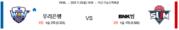 BNK 썸은 직전경기(11/22) 원정에서 KB스타즈 상대로 55-64 패배를 기록했으며 개막전 이였던 이전경기(11/16) 홈에서 신한은행 상대로 65-54 승리를 기록했다. 리바운드(52-46), 3점슛(7-8), 범실(3-3)의 결과. 안혜지(13득점), 박혜진(12득점), 이소희(12득점)가 분전했고 4쿼터 초반에 51-49, 리드를 잡았지만 이후 승부처에서 외곽을 연달아 허용했고 득점이 일단 정지 된 경기. 공수 양면에서 헌신적으로 뛰며 우승에 일조했던 이이지마 사키의 공백을 메우기 위해 영입한 가드 스나가와 나츠키가 결장하면서 토종 선수들로만 경기를 운영하면서 부족한 로테이션이 영향을 줬던 상황. 정규시즌 원정경기에서는 1패 성적.