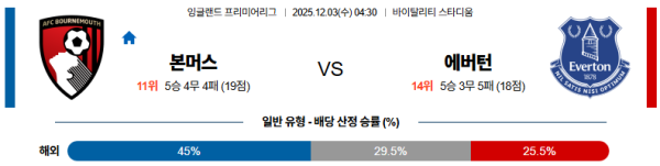 이 경기는 단순히 누가 슈팅을 더 많이 때리느냐가 아니라, 공이 머무는 구역에 어느 팀이 더 많은 숫자를 배치하고, 얼마나 오랫동안 점유율을 쥐고 가느냐가 승부를 가르는 흐름이 될 가능성이 큽니다. 본머스는 볼 주변 수적 우위를 확보한 상태에서 짧은 패스를 연속적으로 주고받는 구조에 특화되어 있습니다. 에바니우송이 중앙에서 기준점을 세워주고, 세메뇨와 태버니어가 안쪽으로 좁혀 들어와 삼각형 패스 루트를 형성하면, 상대가 압박을 걸어와도 탈압박이 한결 수월해집니다. 이렇게 볼 주변에서 수적 우위를 점한 뒤, 측면→중앙→반대측으로 전환 패스를 섞어 주면, 상대 블록은 계속 좌우로 흔들리며 수비 라인이 무거워질 수밖에 없습니다. 볼을 오랜 시간 소유하는 팀이 슈팅 찬스를 더 많이 창출해 낼 수 있고, 상대는 공을 빼앗기 위해 압박을 나가며 더 많이 뛰어야 하므로 체력 소모가 빠르게 누적될 수밖에 없습니다. 특히 본머스는 세메뇨의 직선적인 돌파와 태버니어의 2선 침투, 중거리 슈팅을 믹스하면서 점유와 직선성을 동시에 가져가는 패턴을 자주 보여줍니다. 반면 에버튼은 공을 빼앗은 이후에도 빌드업과 전진 과정에서 한 박자씩 템포가 끊기면, 다시 본머스의 역압박에 말려들며 점유율을 되돌려주는 장면이 반복될 위험이 큽니다. 그릴리쉬 쪽으로 공격이 쏠리는 구간이 길어지면, 본머스는 해당 구역에 숫자를 더 붙여 압박 강도를 올리면서, 반대편 공간을 과감하게 버리고 한쪽 라인만 틀어막는 선택을 할 수도 있습니다. 이렇게 되면 에버튼은 볼을 탈취한 직후에는 나쁘지 않아 보이지만, 두세 번의 패스 이후 다시 본머스에게 공을 내주고 수비 태세로 돌아가는 시간을 길게 가져가야 합니다. 현대축구 무대에서 볼 점유율 장악 능력이 얼마나 중요한지, 본머스는 이미 최근 여러 경기에서 보여준 바 있고, 오늘 경기 또한 그 흐름을 이어갈 수 있는 최적의 매치업이라 볼 수 있습니다. 특히 홈에서 치르는 경기라는 점까지 감안하면, 본머스는 초반부터 볼을 잡고 템포를 높이려 할 것이고, 에바니우송을 축으로 한 박스 안 공격 빈도도 자연스럽게 증가할 가능성이 큽니다. 에버튼 입장에서는 더블 피벗과 듀스버리 홀이 어느 정도 버티면서 한두 번씩 라인을 깨는 장면을 만들 수는 있겠지만, 전체적인 시간대별 흐름에서 본머스의 점유와 압박에 끌려갈 공산이 큽니다. 따라서 전반에는 에버튼이 버티는 구간도 나오겠지만, 시간이 지날수록 체력 소모와 수비 집중력 저하가 겹치면서 본머스가 중원과 측면에서 다시 수적 우위를 확보하는 장면이 점점 더 자주 연출될 수 있습니다. 결국 이러한 점유율과 수적 우위 기반의 전술 상성이 누적되면, 어느 순간 에바니우송의 문전 침투나 세메뇨의 측면 돌파, 태버니어의 세컨 슈팅이 결승골로 연결되는 흐름까지 충분히 기대해 볼 수 있는 경기입니다.