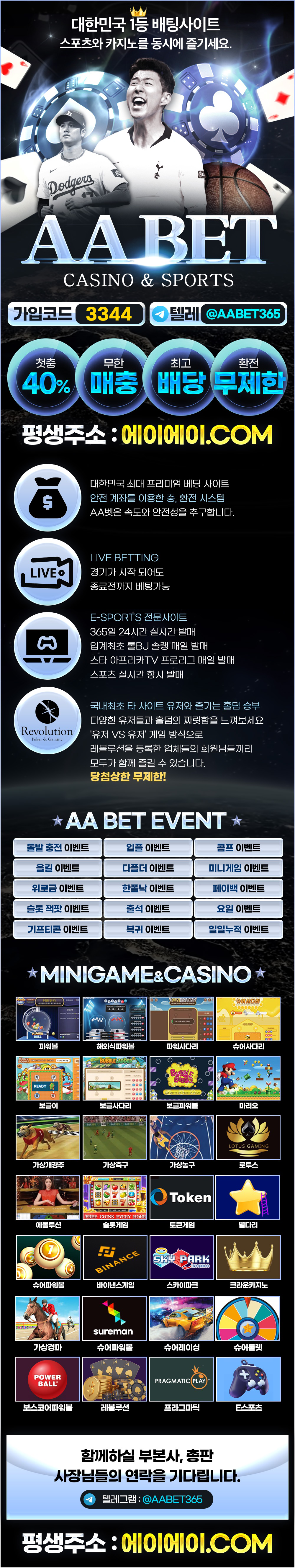 AA벳(AABET)은 스포츠와 카지노, 미니게임을 함께 제공하는 통합형 프리미엄 베팅사이트입니다.