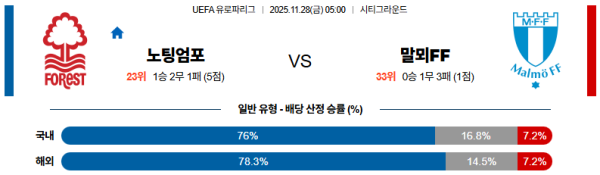 이번 경기는 단순히 홈과 원정의 차이만이 아니라, 세컨볼을 어느 팀이 먼저 선점하느냐가 곧바로 득점 기대값으로 이어지는 매치업입니다. 말뫼FF는 중원에서 상대의 변칙적인 압박과 세컨드볼 대응이 불안해, 첫 패스를 끊긴 뒤 곧바로 문전 근처까지 침투를 허용하는 장면이 반복되고 있습니다. 따라서 상대에게 결정적인 공격 기회를 허용하며 무너지는 그림이 자주 나타나는데, 이번 상대가 라인 사이 공간 활용에 능한 노팅엄이라는 점을 감안하면 이 약점은 더욱 도드라질 수밖에 없습니다.