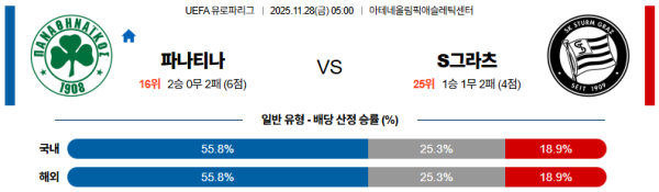 따라서 전술 구조와 홈 텃세, 세트피스 상성을 모두 감안할 때, 이 경기는 스트럼 그라츠가 얼마나 오랫동안 버틸 수 있을지가 관건이며, 결국 파나시나이코스가 흐름을 잡고 득점까지 연결할 가능성이 더 높다고 볼 수 있습니다. 특히 후반으로 갈수록 스트럼 그라츠의 클리어링이 짧아지고, 세컨드 지역에서 볼이 자주 떠 있는 장면이 나오면, 파나시나이코스의 장신 자원들이 이를 공략해 추가 득점 찬스를 만드는 모습이 충분히 그려질 수 있습니다.
