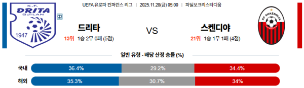 드리타는 무스타파를 중심으로 한 템포 조절과 빠른 방향 전환으로 박스 주변에서 다양한 공격 옵션을 만들어내는 팀입니다. 반면 슈켄디야는 측면 전환 타이밍이 늦어지는 구조적 한계로 인해 팀 전체의 템포가 살아나지 않는 구간이 길어질 수 있습니다. 따라서 전체적인 전술 완성도와 전환 속도, 세컨존 경쟁력을 종합적으로 고려할 때 드리타의 승리를 예상하는 것이 합리적입니다.