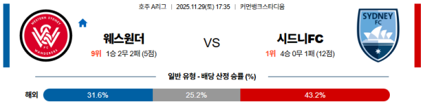 웨스턴 시드니는 홈 이점이 있음에도 불구하고, 최근 부진한 경기력과 포백의 불안한 간격 관리가 발목을 잡을 가능성이 높습니다. 반면 시드니FC는 캄푸차노 보니야의 버팀목 역할, 롤리의 뒷공간 침투, 오콘-엥스틀러의 박스 안 움직임을 바탕으로 전방에서 더 많은 위협을 꾸준히 만들어낼 수 있는 팀입니다. 따라서 전술 완성도와 결정력, 그리고 현재 흐름을 종합적으로 고려할 때, 이 더비는 시드니FC가 승점을 가져갈 가능성이 더 높다고 볼 수 있습니다.