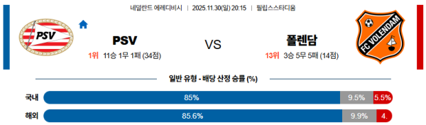 스하우턴이 후방에서 안정적으로 볼을 배급해 주고, 페리시치와 풀백들이 측면에서 폭을 확보해 주면, 반 봄멜은 자연스럽게 안쪽으로 좁혀 들어와 슈팅 각도를 만드는 패턴을 반복할 수 있습니다. 반면 폴렌담은 베어만과 쿠와스, 뮈렌의 개별 능력으로 공격 전환 시 위협적인 장면을 만들 수는 있지만, 중원 간격이 한 번 벌어지면 수비 라인이 동시에 무너지는 장면이 자주 발생합니다. 따라서 경기 시간이 지날수록 아인트호벤의 전방 압박과 템포 조절에 폴렌담이 끌려다니는 그림이 나올 가능성이 높고, 두 팀의 슈팅 숫자와 박스 점유율 격차도 점점 벌어질 수 있습니다. 결국 이 매치는 아인트호벤이 홈에서 템포와 볼 점유율, 파이널 서드 지배력까지 모두 쥐고 가며, 선제골을 포함해 다득점까지 노릴 수 있는 경기 흐름에 가깝다고 보는 것이 합리적입니다.