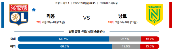 리옹은 인버티드 풀백과 중원 숫자 싸움을 기반으로, 볼 점유율과 경기 템포를 주도하며 낭트 포백을 지속적으로 흔들 수 있는 전술적 토대를 갖추고 있습니다. 반면 낭트는 홀딩 미드필더 한 명에게 수비와 빌드업 부담이 동시에 쏠려, 라인이 내려앉는 순간부터는 박스 앞 공간을 정교하게 관리하기가 쉽지 않은 구조입니다. 세트피스 상황에서 메이틀랜드 나일스의 인프런트 프리킥까지 더해지면, 이 경기는 리옹이 홈에서 흐름을 잡고 결과까지 가져갈 확률이 더 높은 승부라고 판단됩니다.